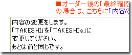 ちなみに…オーダー完了後に変更に気付いた場合の「再オーダー」の時は、右図のように、「オーダー内容」の一番最初に「内容の変更をします」といった文字を必ず最初に記入してください。最初に書いた文字ほど認識率がいいからです。